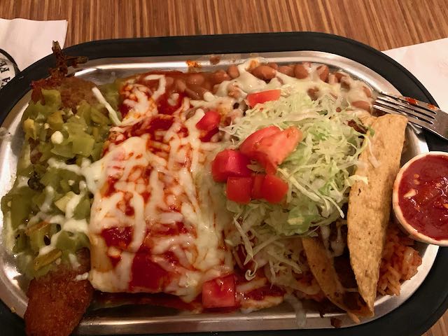 A great meal in Santa Fe at Tomasita’s. Complete with a mariachi band. Combo platter. Note the ubiquitous green chiles!