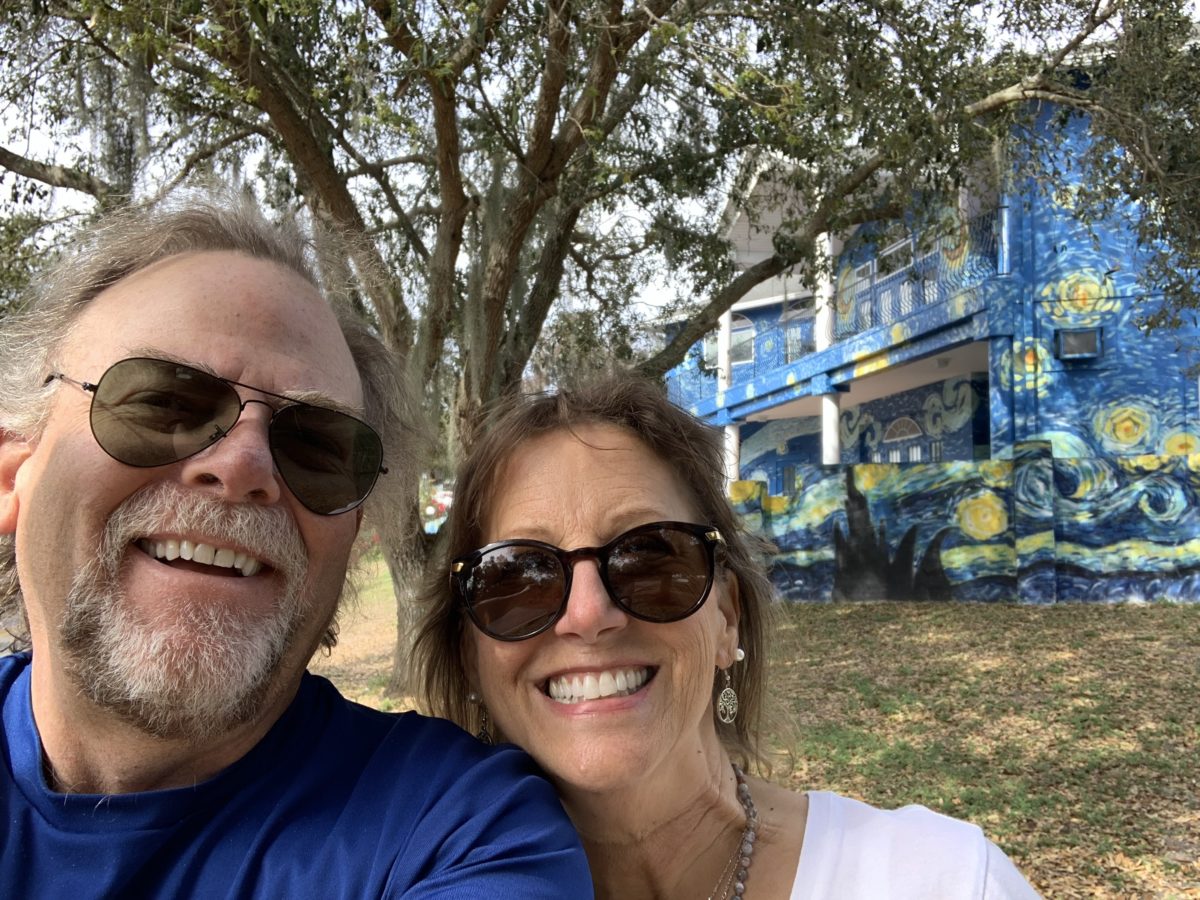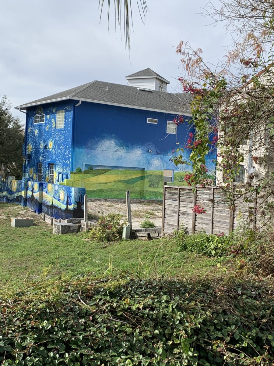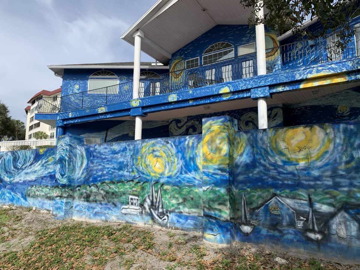 The story: a couple had an autistic son that liked Van Gogh’s “Starry Nights” so they painted the fence with that motif. Neighbors didn’t like it and bitched. The city said “the fence needs to go with the house.” So they painted the house.