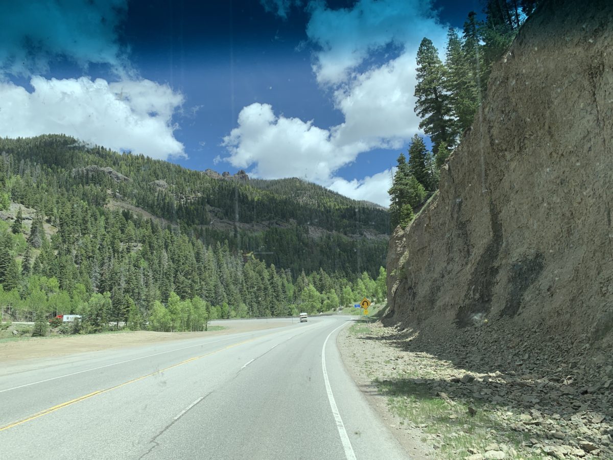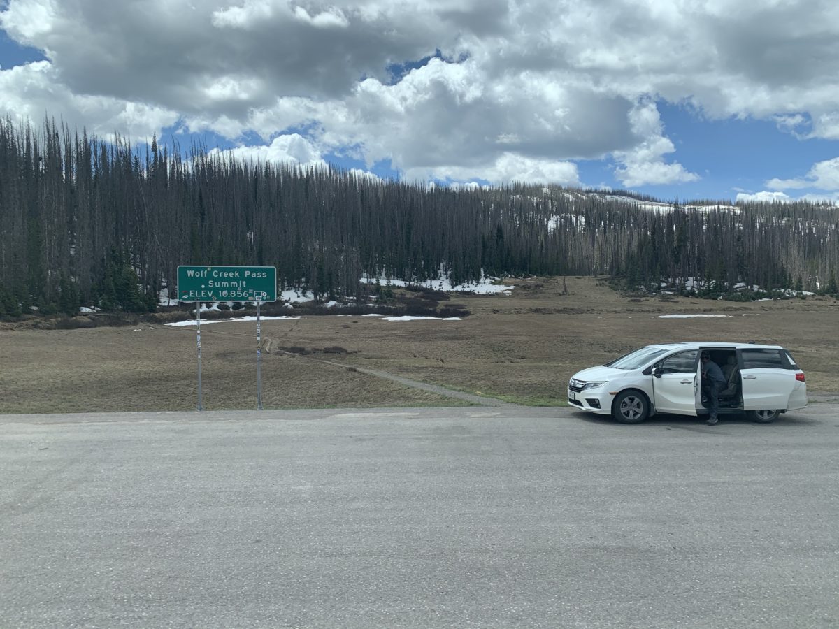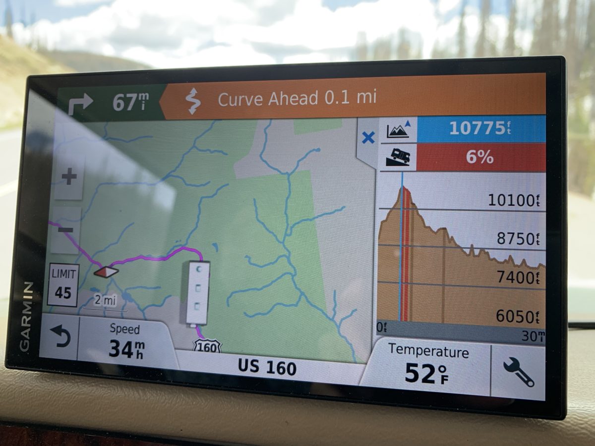 The continental divide! Nearly 11,000 feet with The Raven. 30 mph on the way up, 40 or so going down. Great having engine braking in a diesel. The Garmin shows the elevation change.