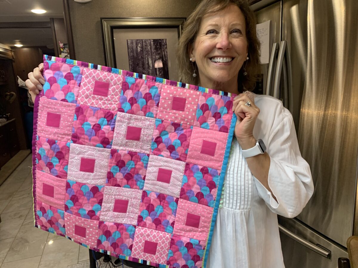 Lisa went to a quilting class at the RV resort. Looks great! This little “training quilt” is going to our new grand-dog, Sashi. Pink is her favorite color. (Reportedly)